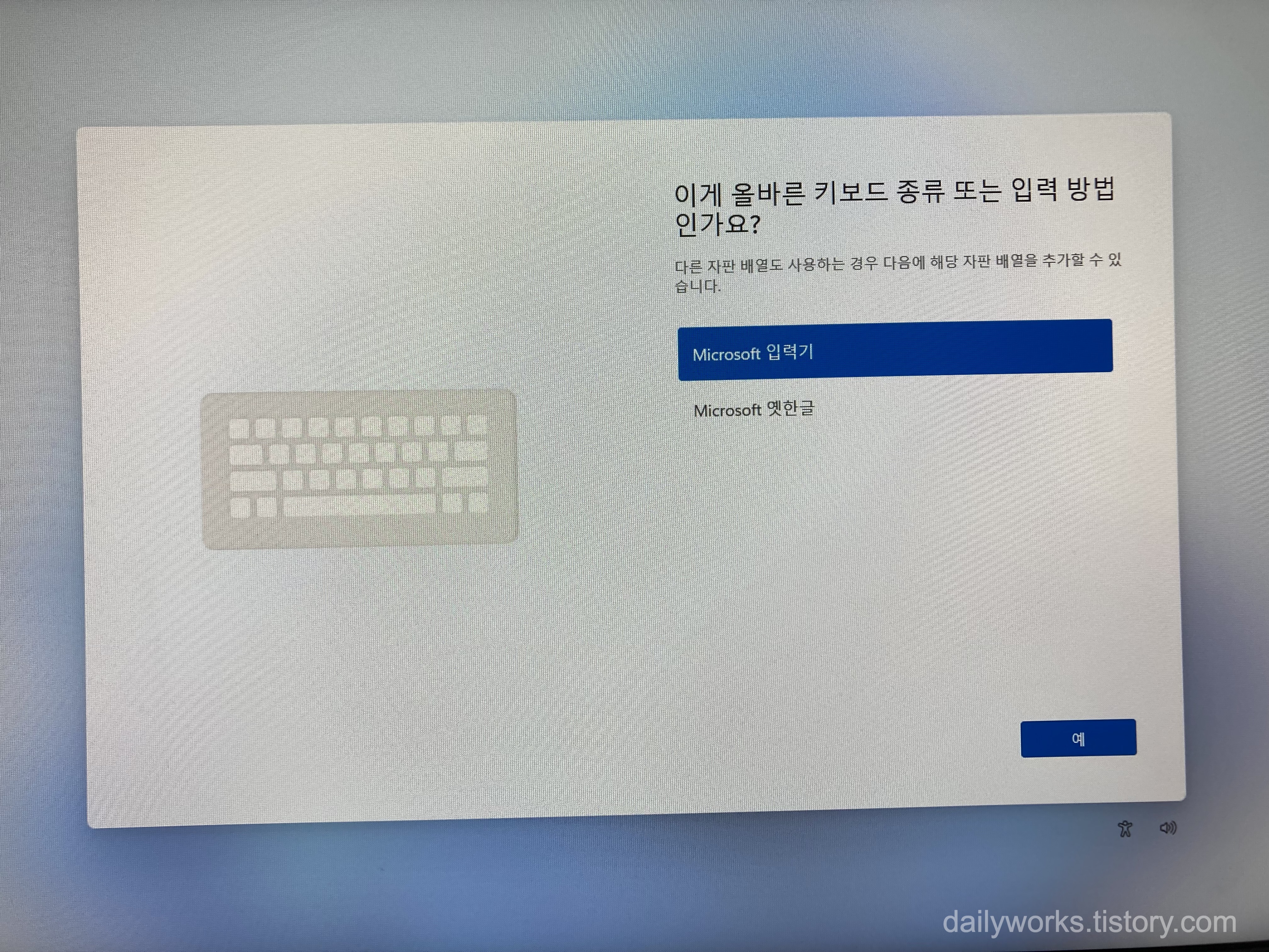 - "이게 올바른 키보드 종류 또는 입력 방법인가요?" → [예]를 클릭