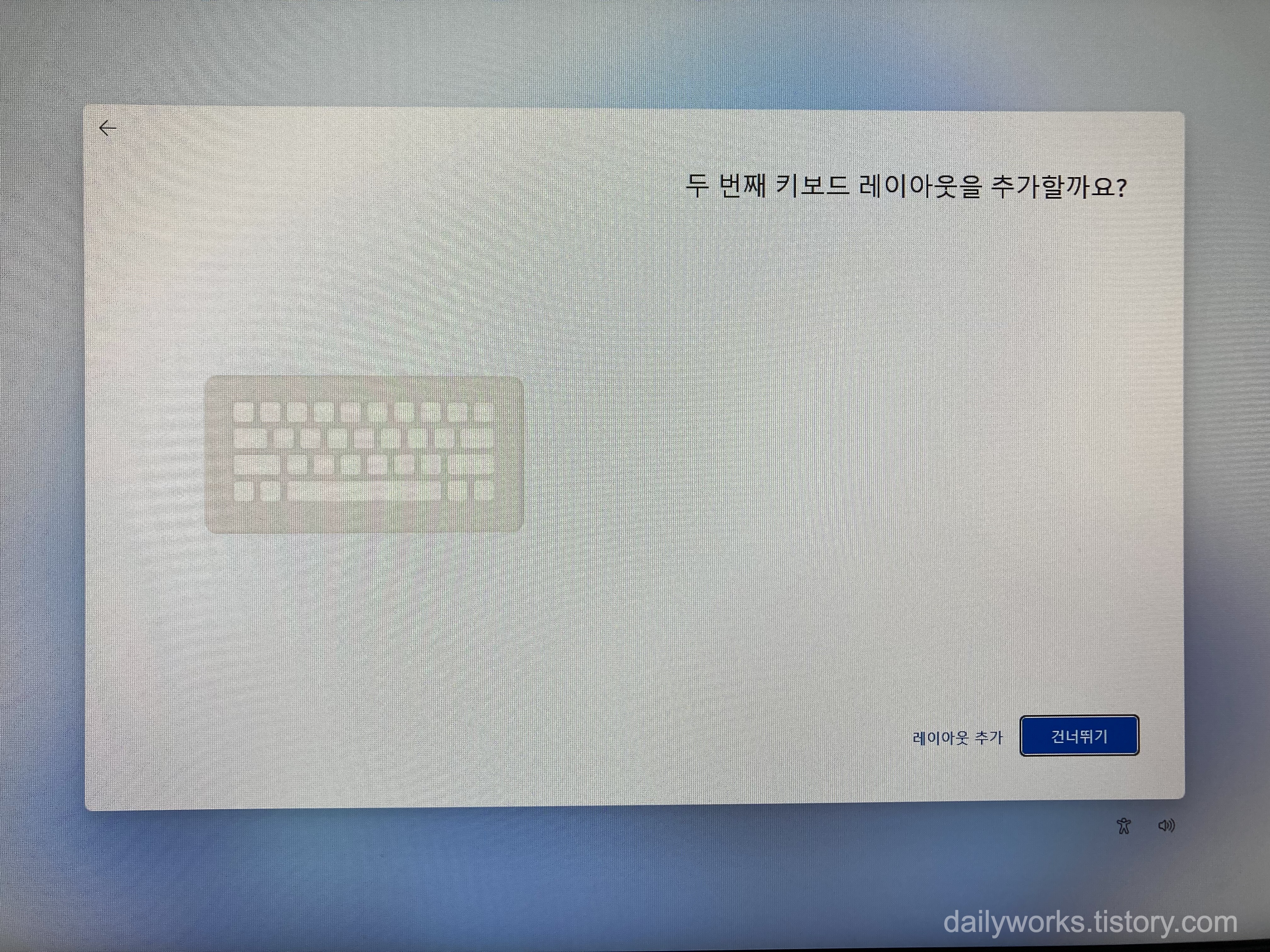 - "두 번째 키보드 레이아웃을 추가할까요?" → [건너뛰기]를 선택