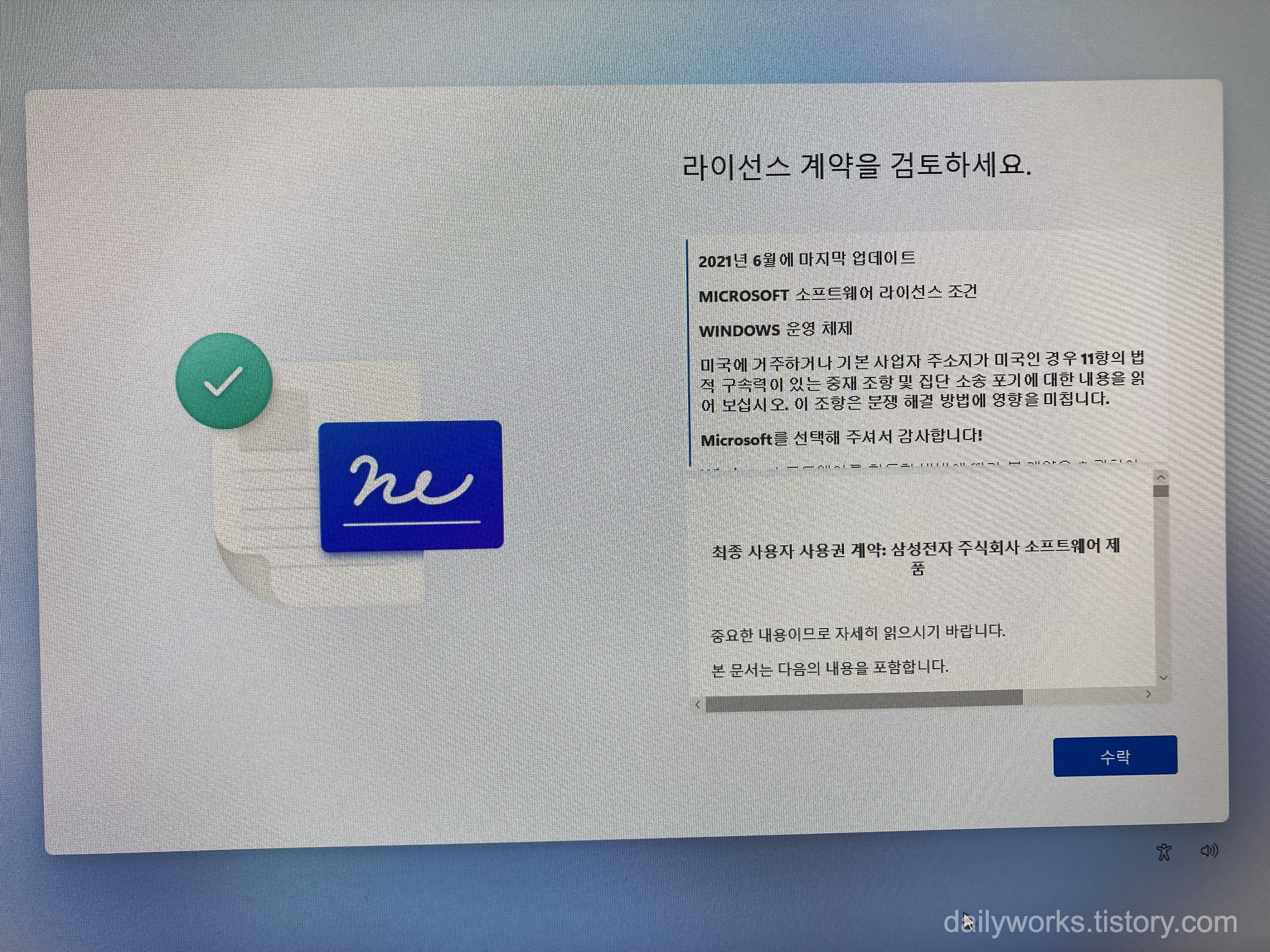 Windows 소프트웨어 라이선스 계약서가 나타납니다.