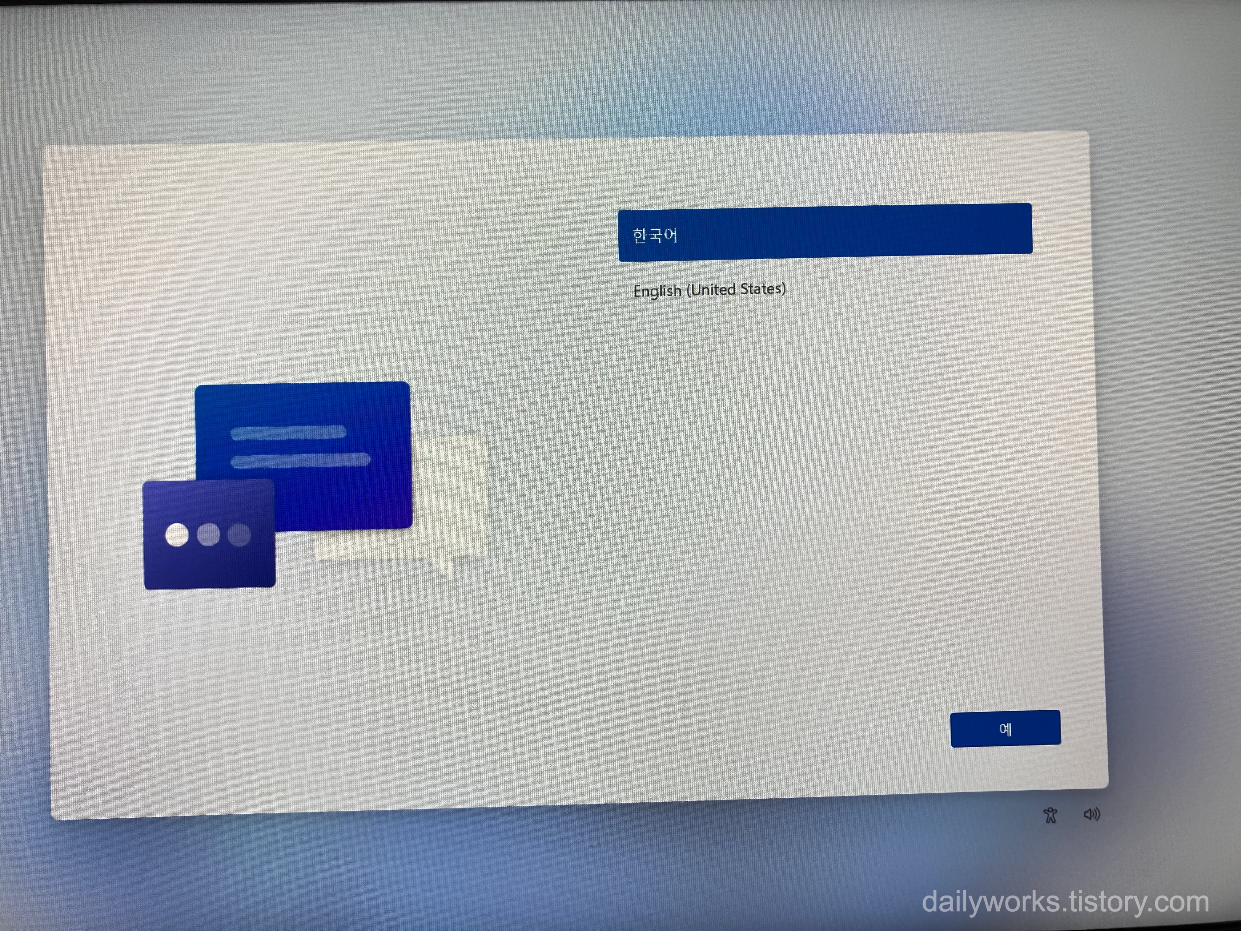 윈도우 11 설치가 완료되면 가장 먼저 언어 선택 화면이 뜹니다.