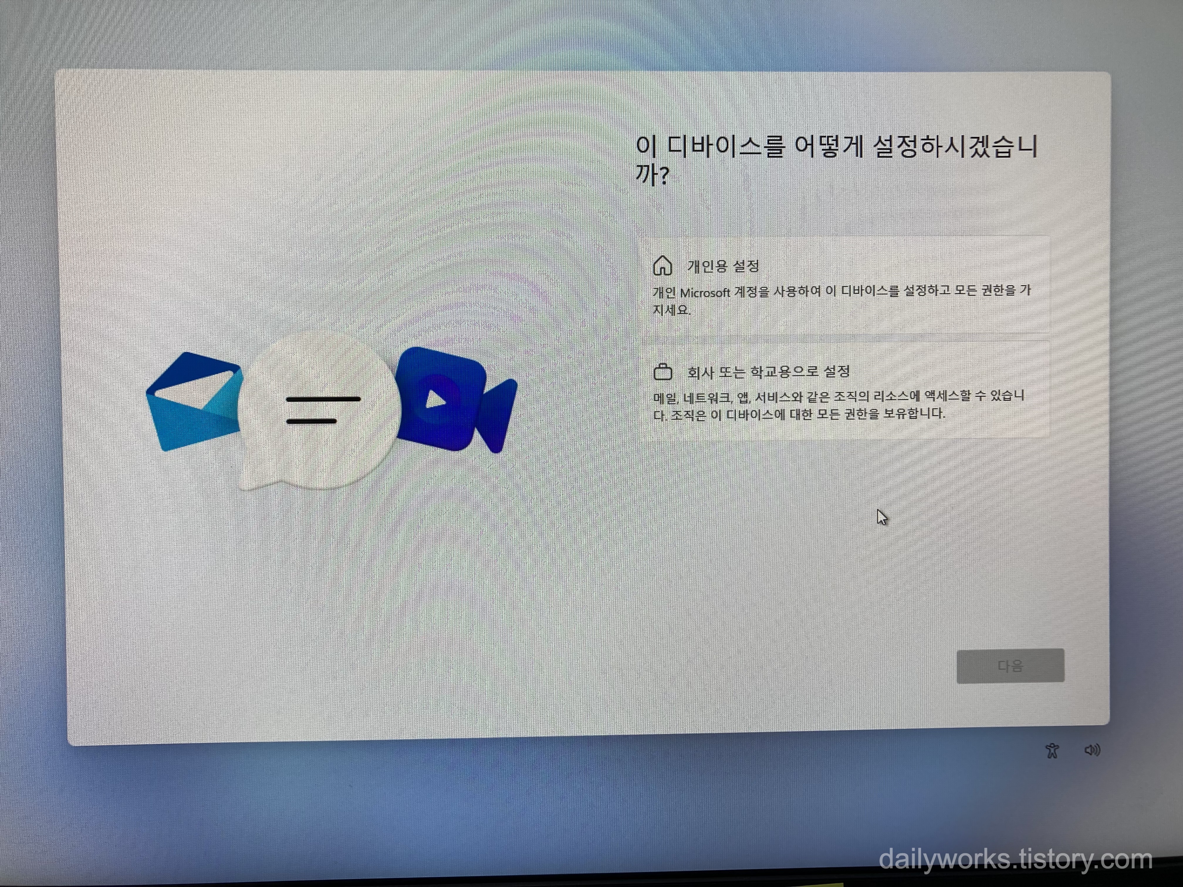 [회사 또는 학교용으로 설정] 을 선택합니다.