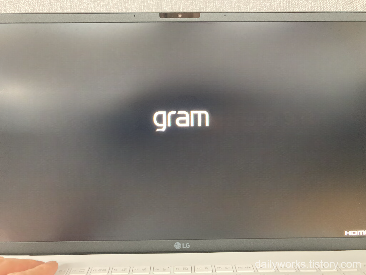 그램 로고가 보이기 시작하면 F2 키를 반복 눌러 BIOS 진입을 시도합니다.