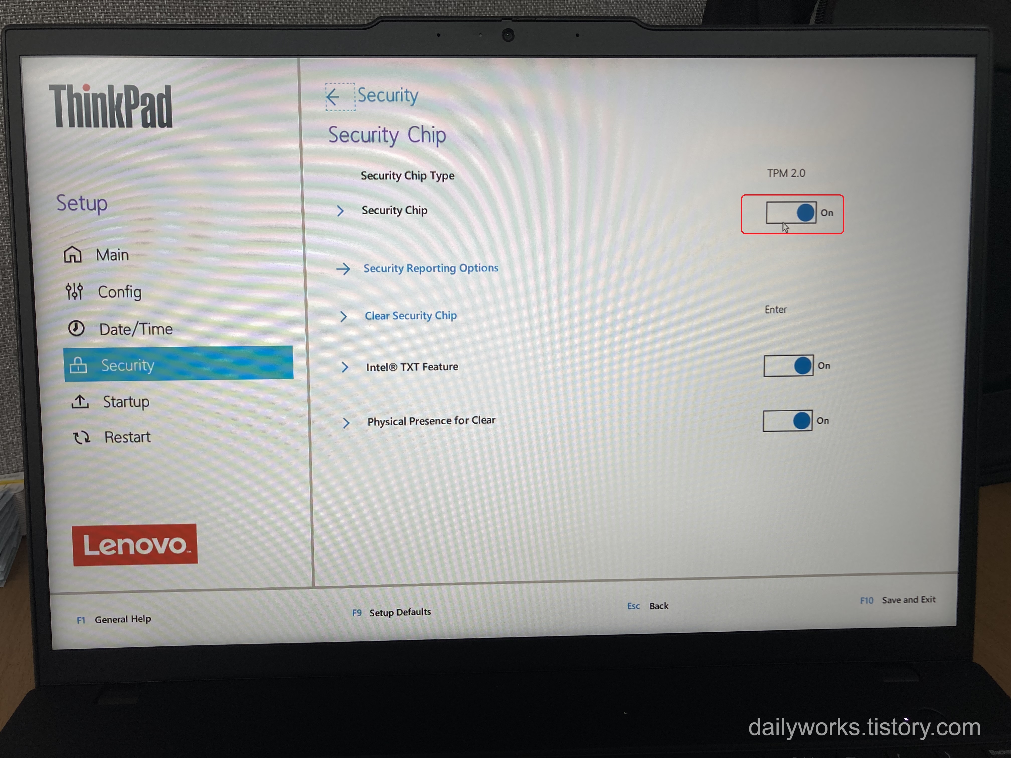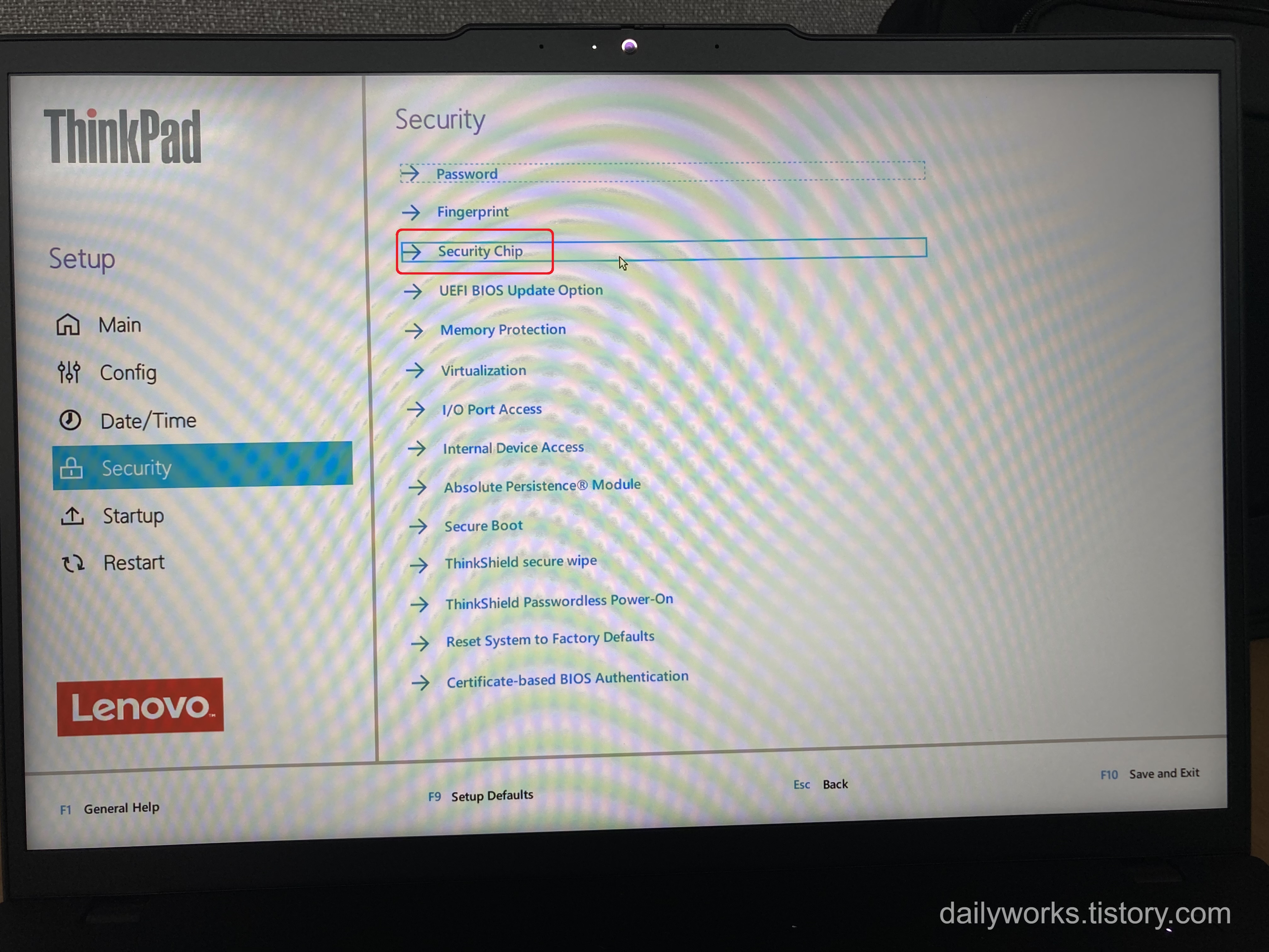 - Security Chip이 Disabled로 되어 있다면 TPM이 비활성 상태입니다.