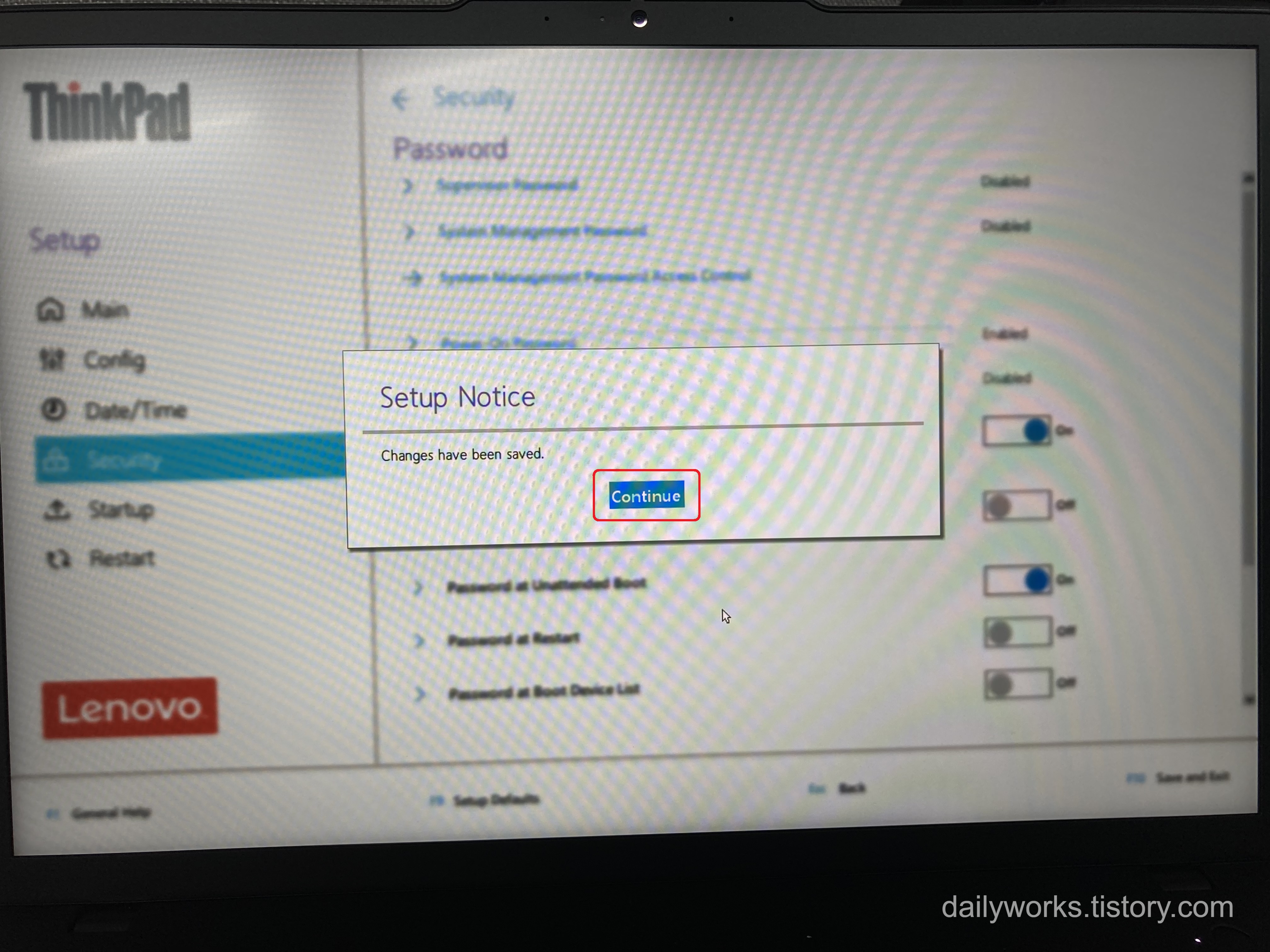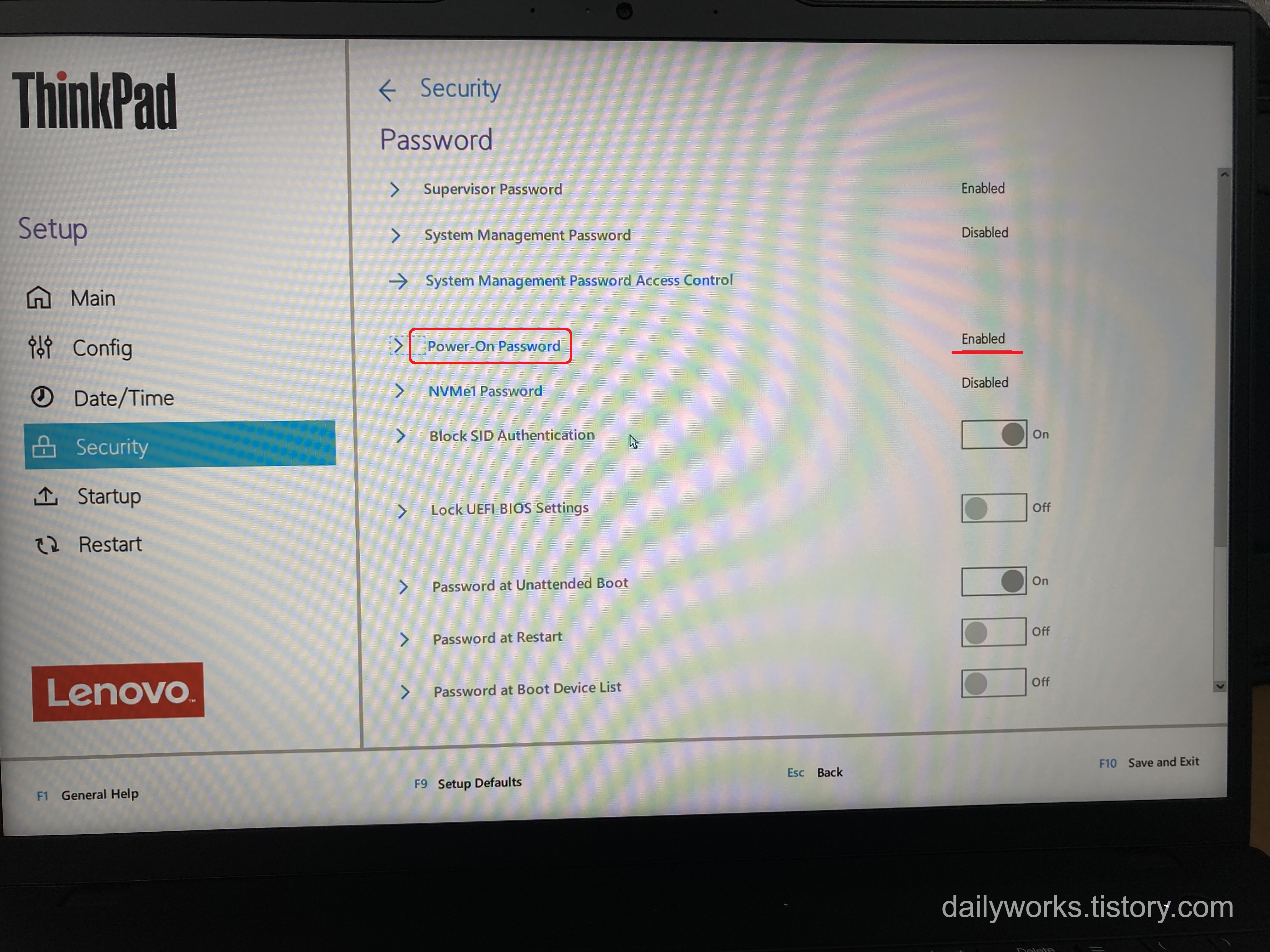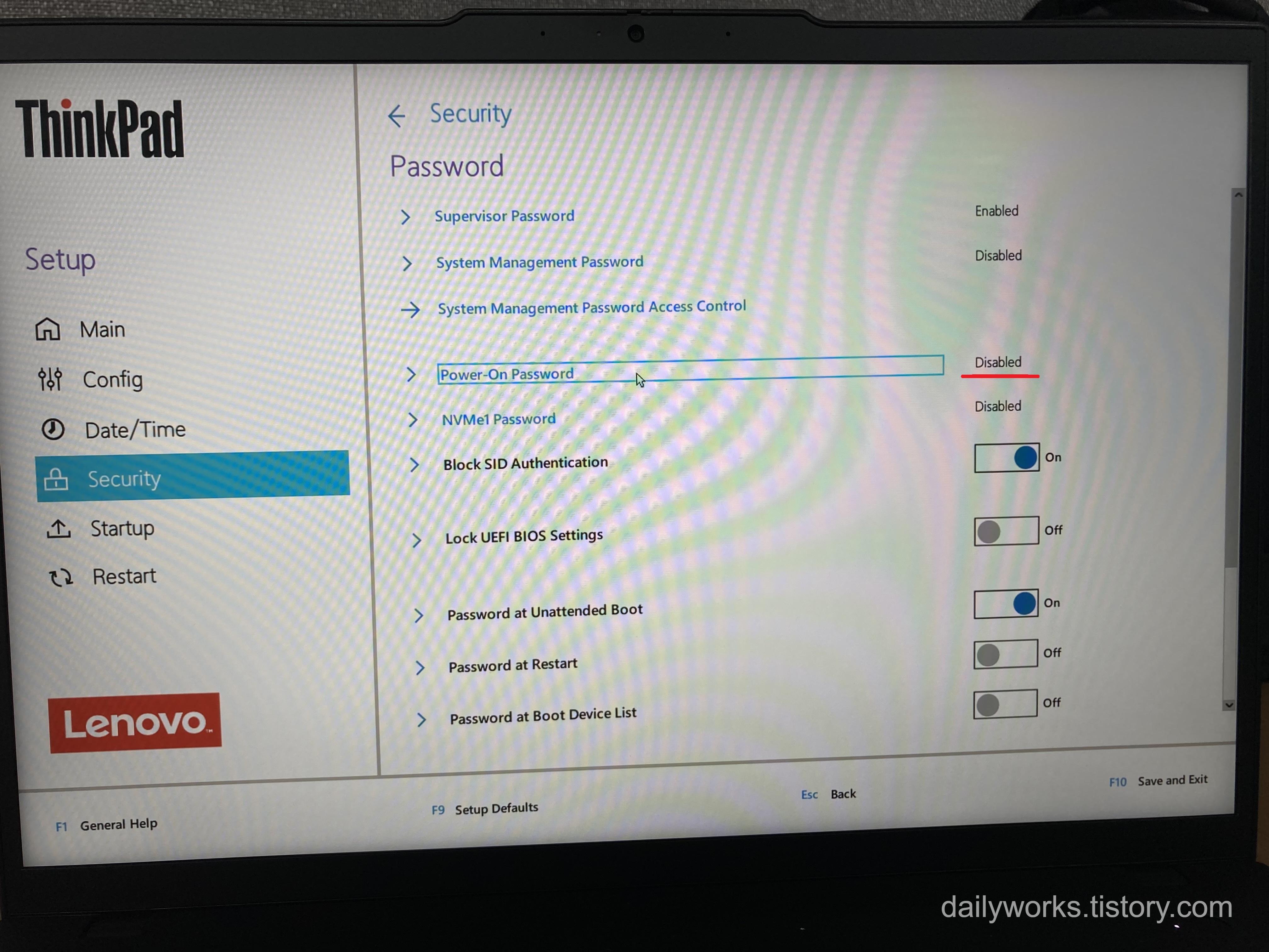7️⃣ Power-on Password 상태 → Disabled로 변경 확인