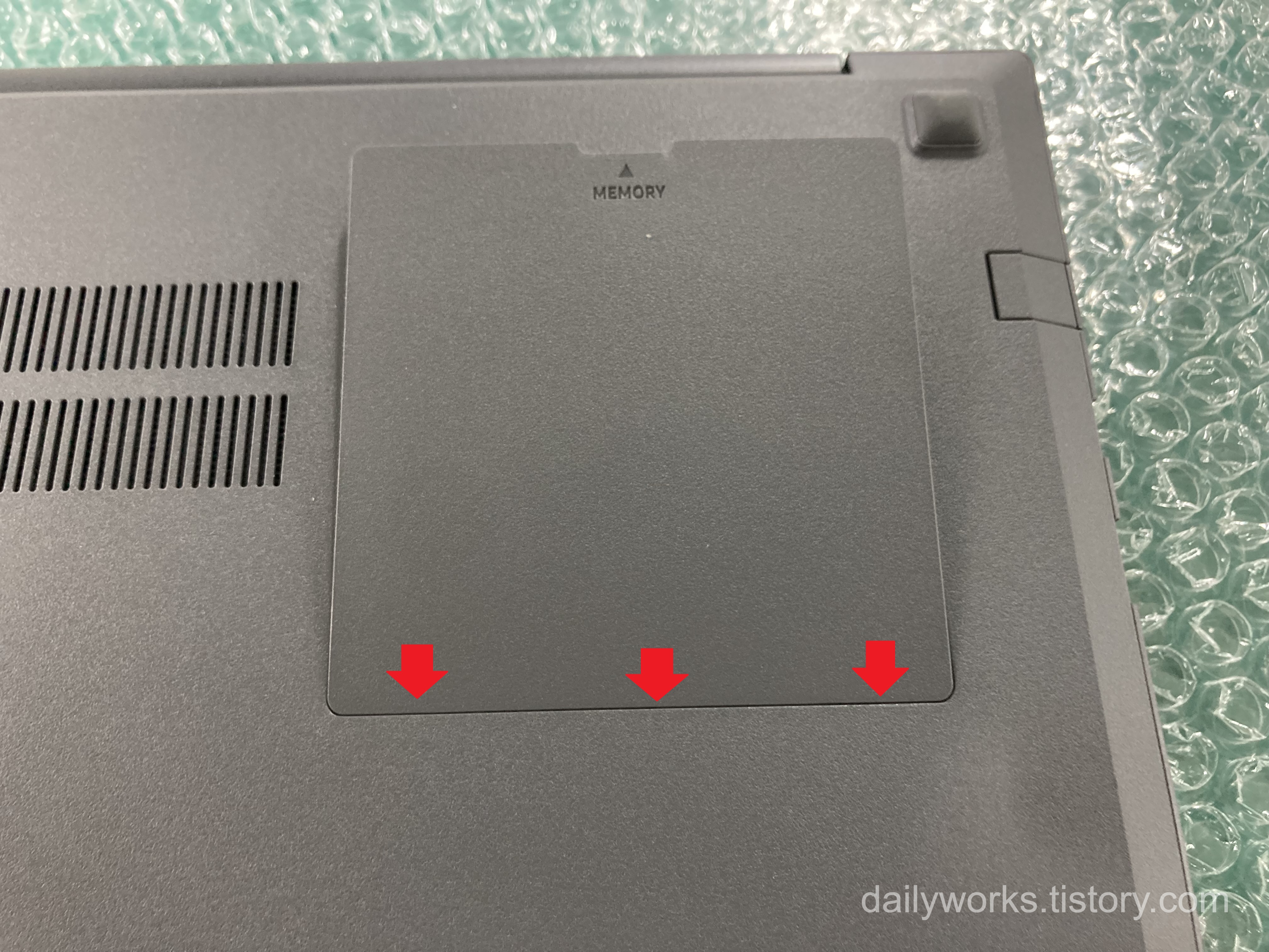노트북을 뒤집으면 하단에 MEMORY라고 표기된 부분이 있습니다.