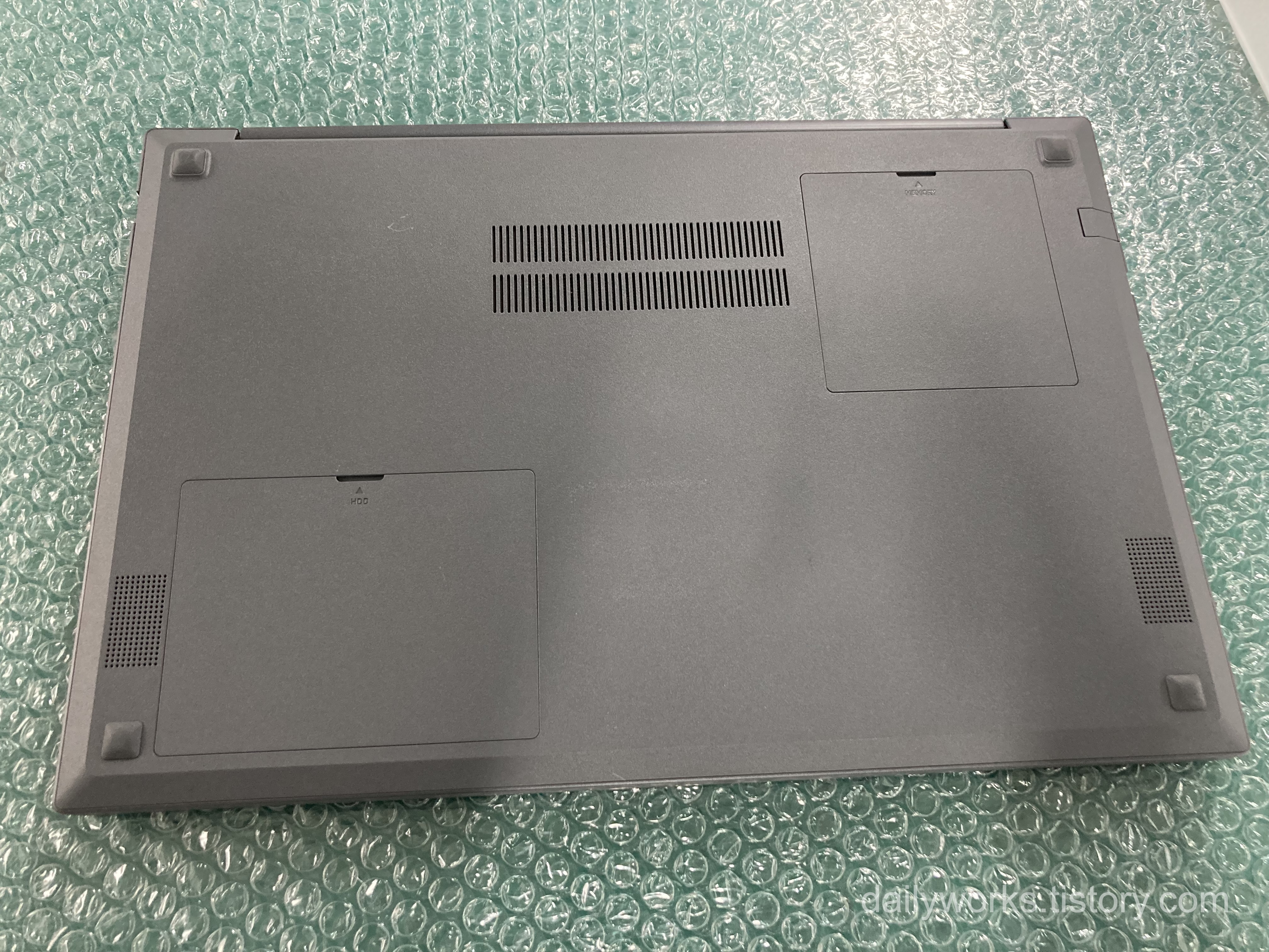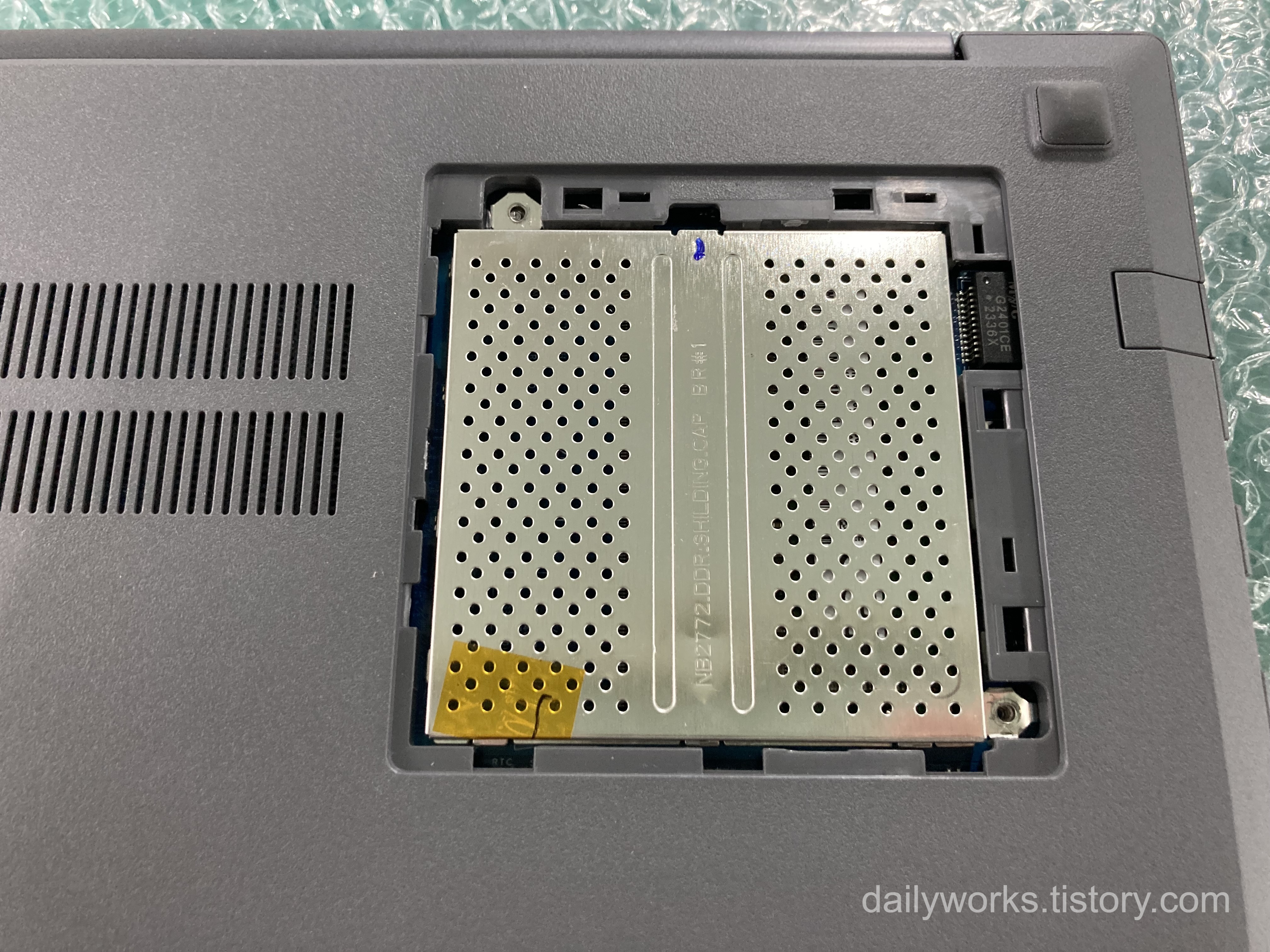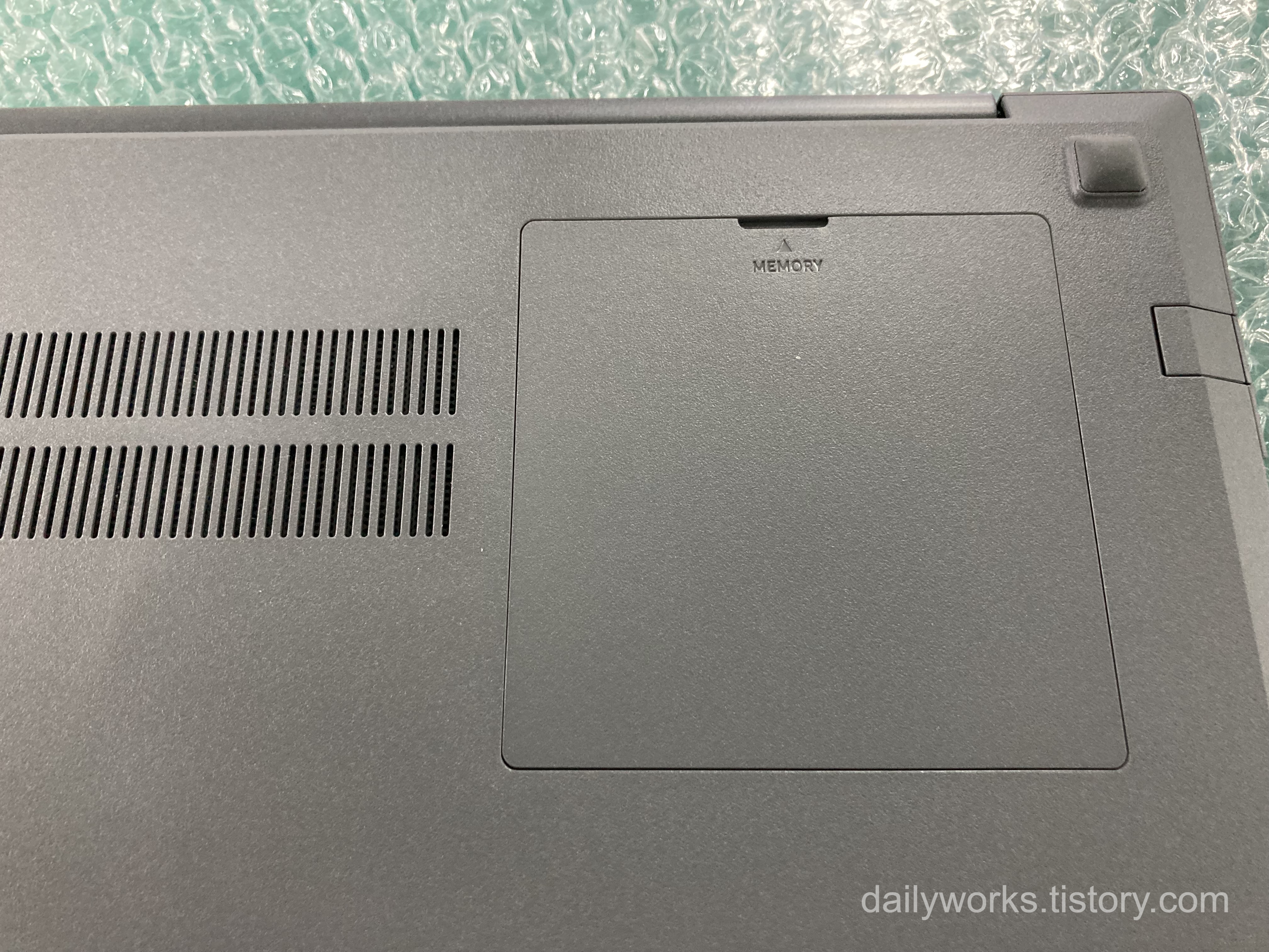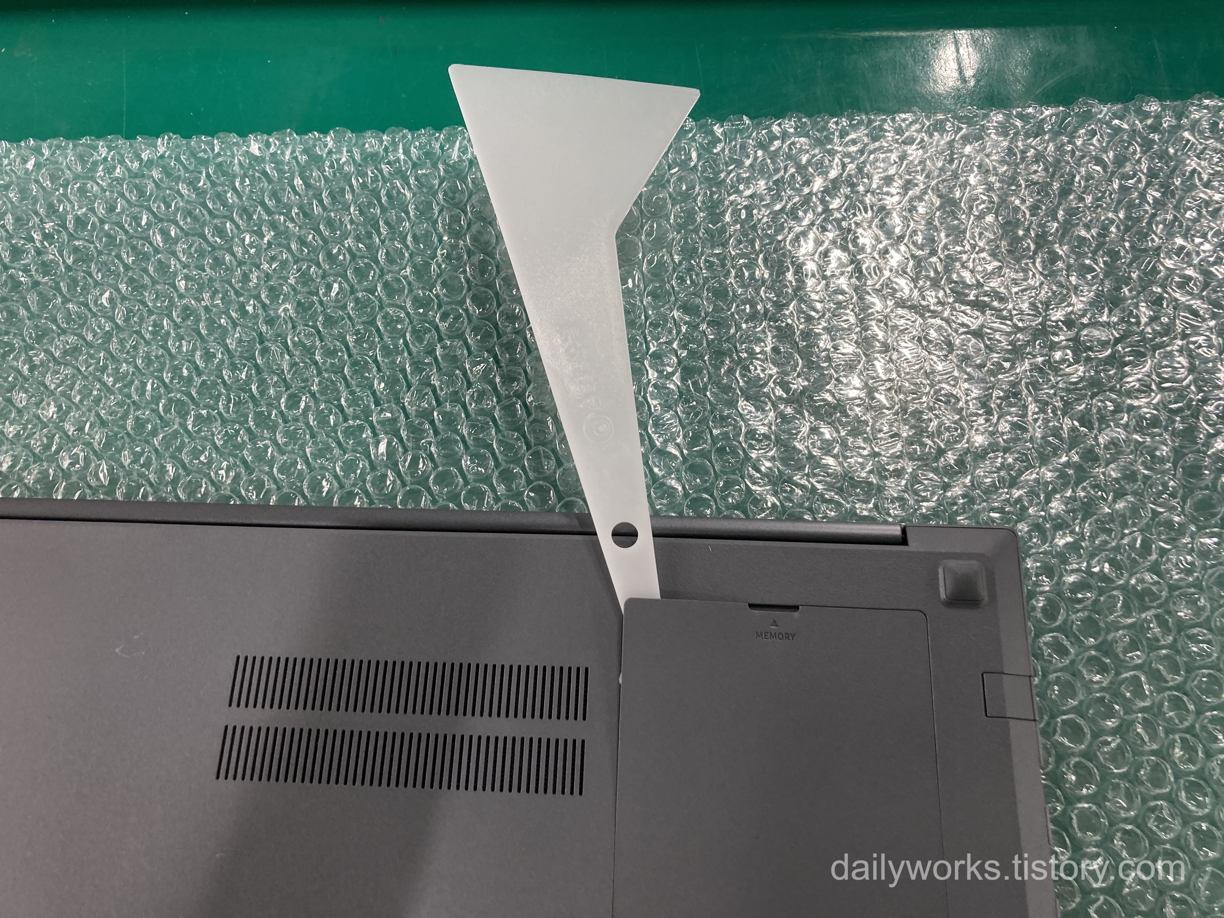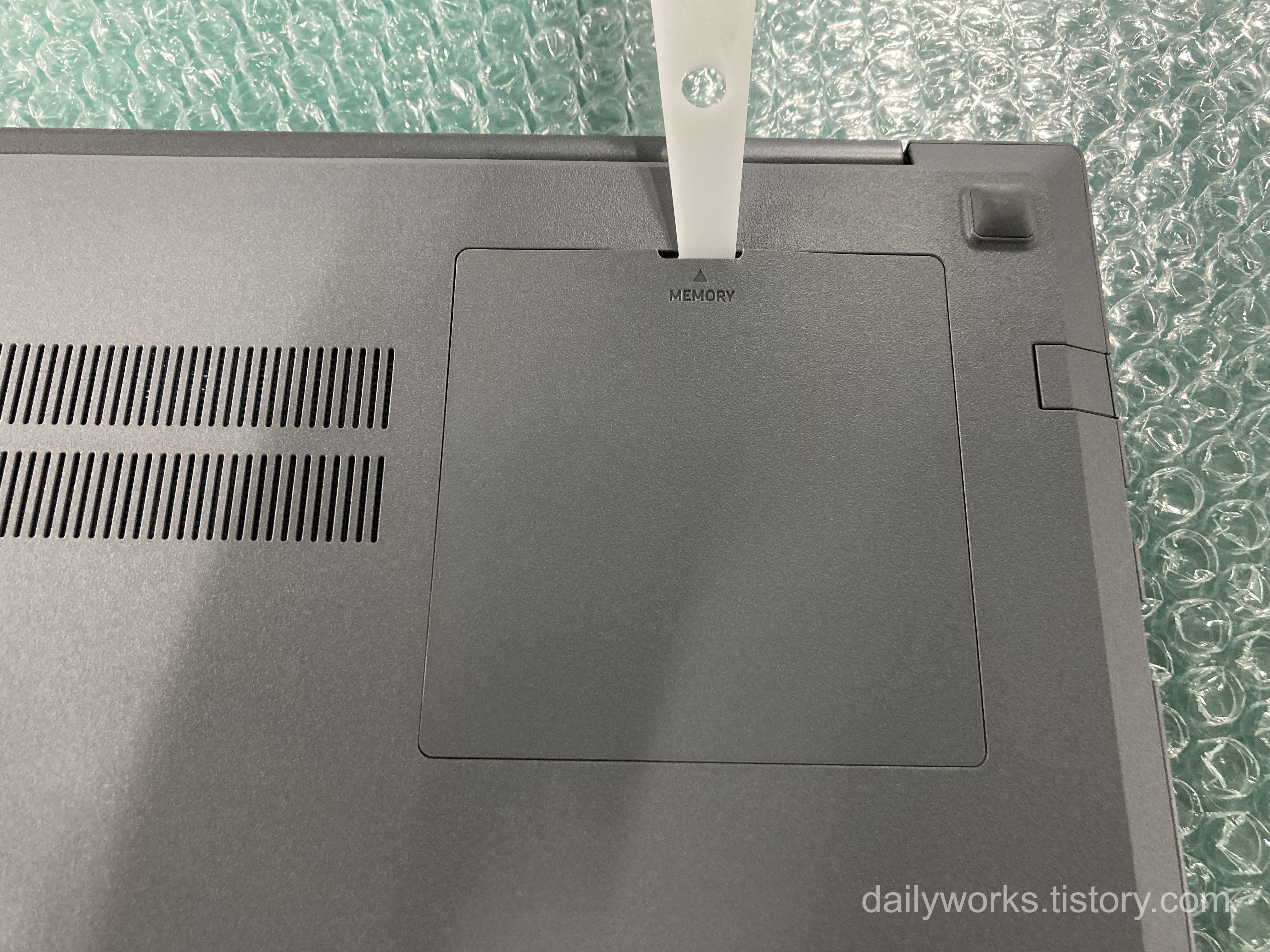 이곳이 RAM 업그레이드 슬롯 커버이며, 나사나 클립이 없는지 확인 후 조심스럽게 진행해야 합니다.