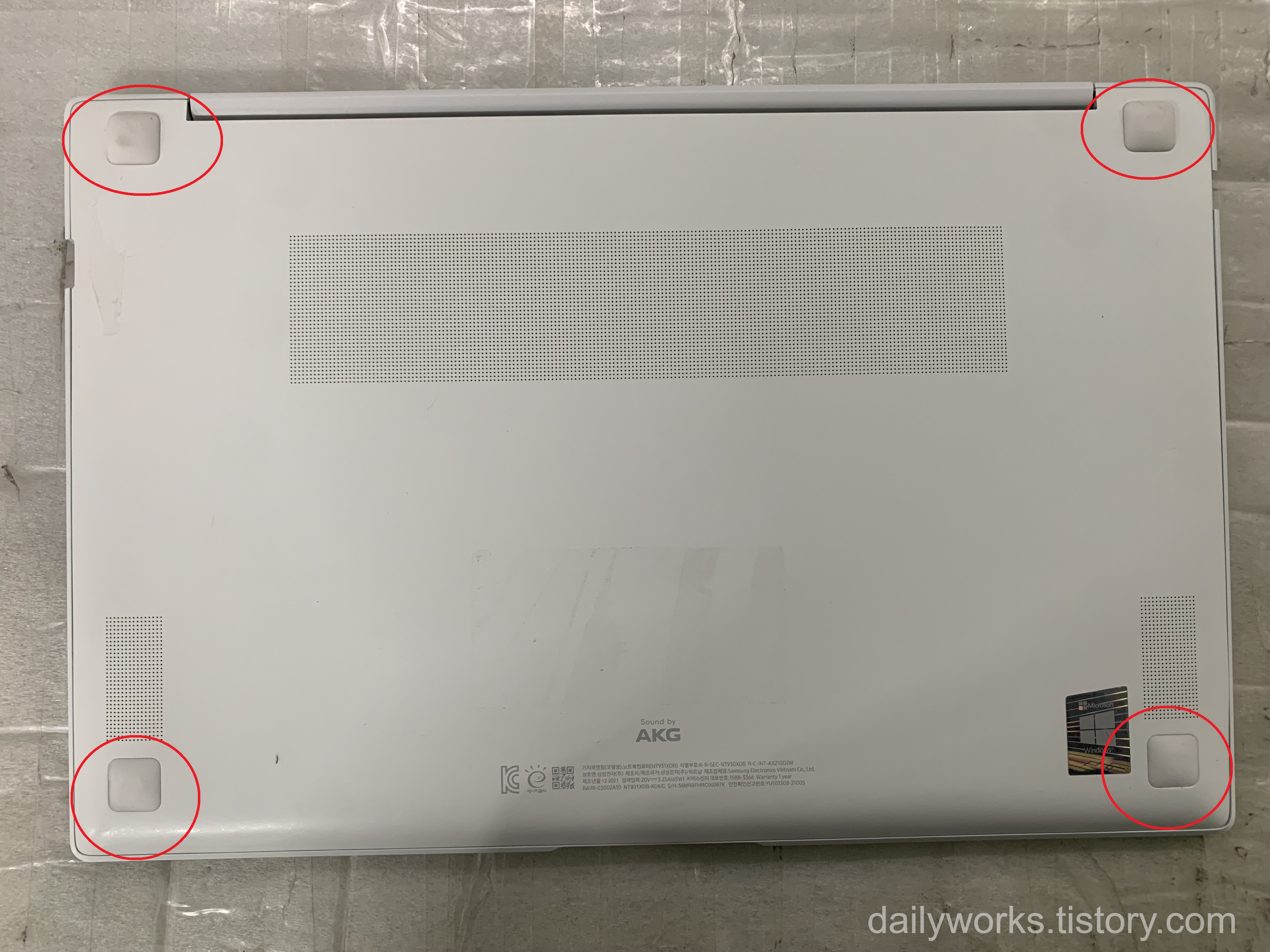 바닥의 고무 패킹 4곳 아래에 나사가 숨겨져 있습니다.